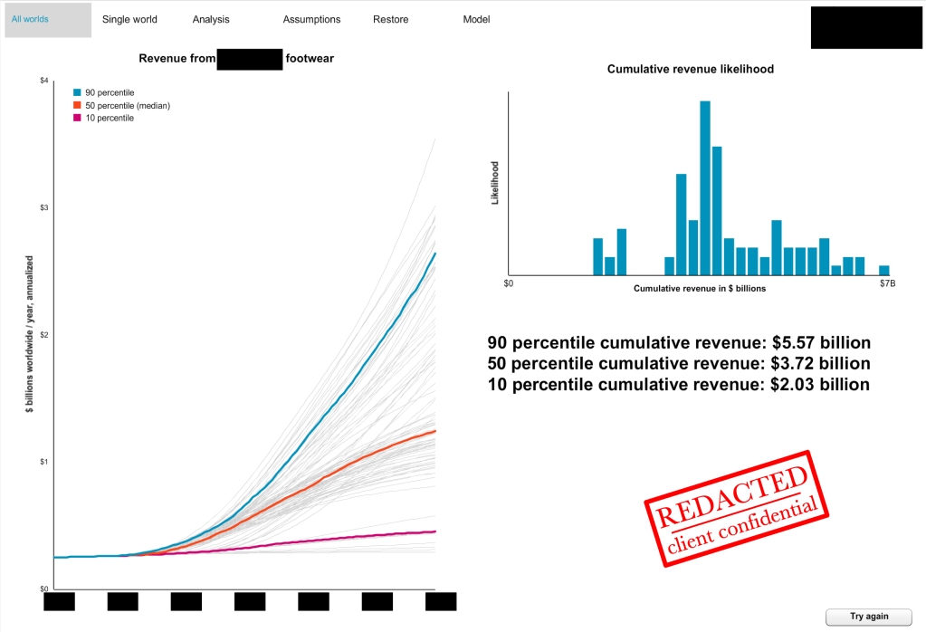 Create a Monte Carlo simulation to estimate the value of the network of R&D projects, and the uncertainty associated with that value. Visualize the results of the simulation in an interactive application.